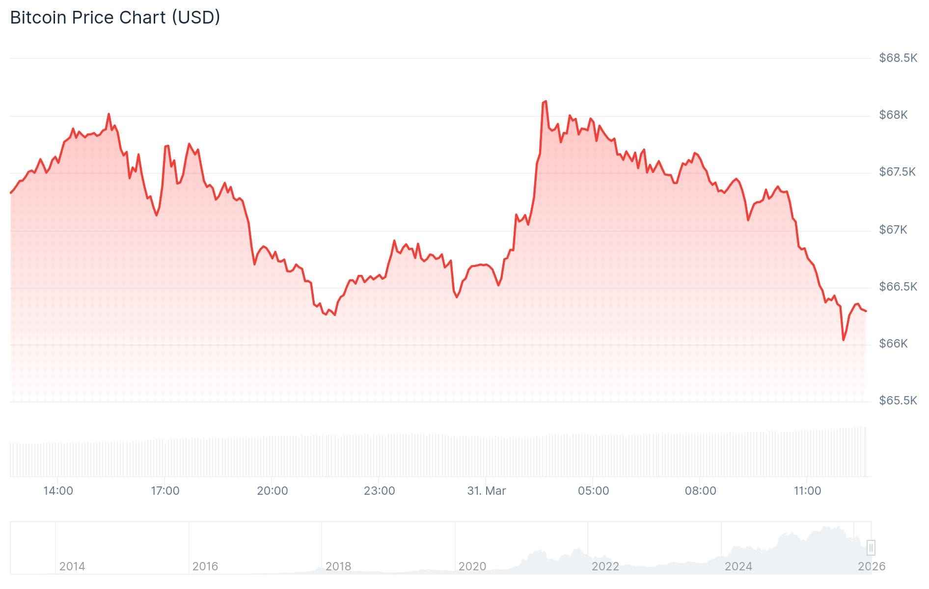 A las 12:00 horas, se alcanzó el punto más bajo de 66.000 dólares, lo que representa una caída del 3,3 por ciento.
