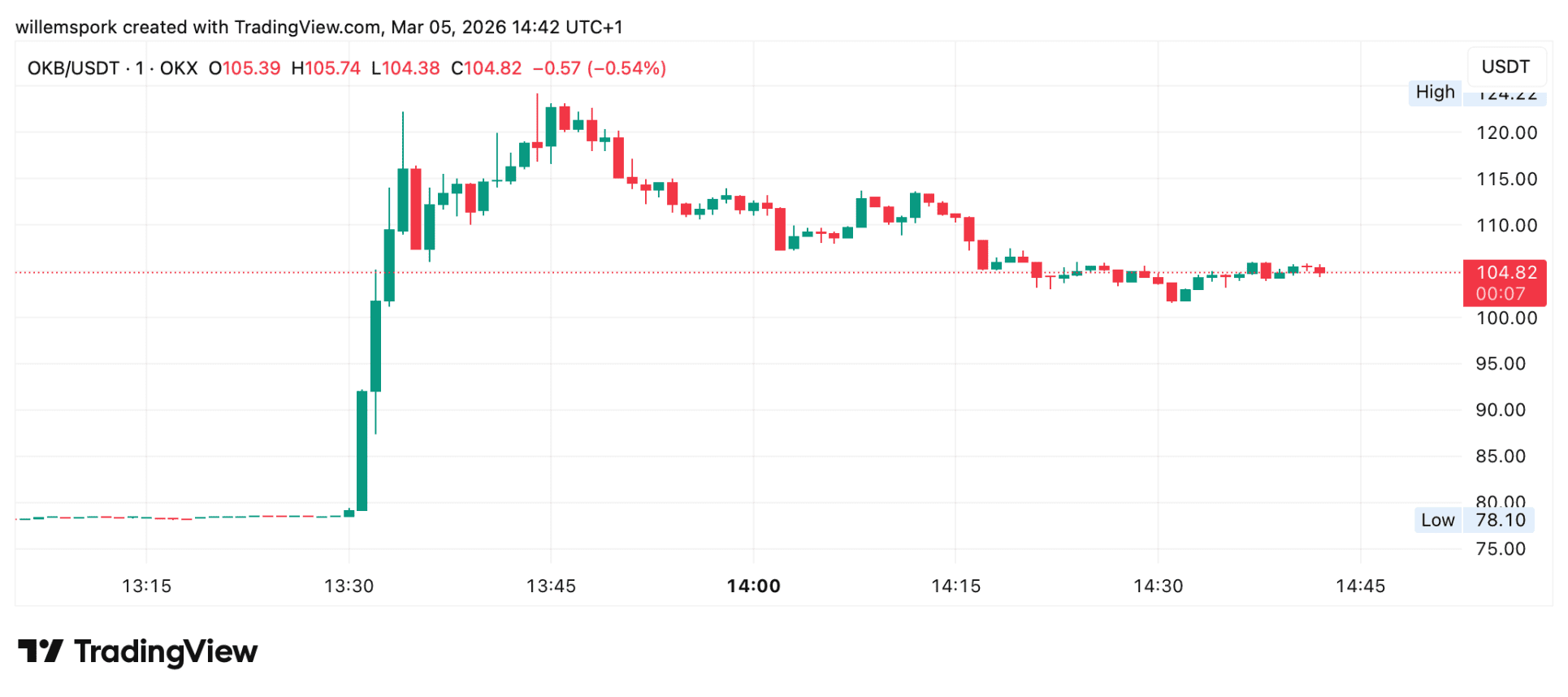 Según datos del mercado, el precio de OKB se sitúa actualmente alrededor de los 104 dólares, todavÃa muy por encima del nivel antes de la noticia.