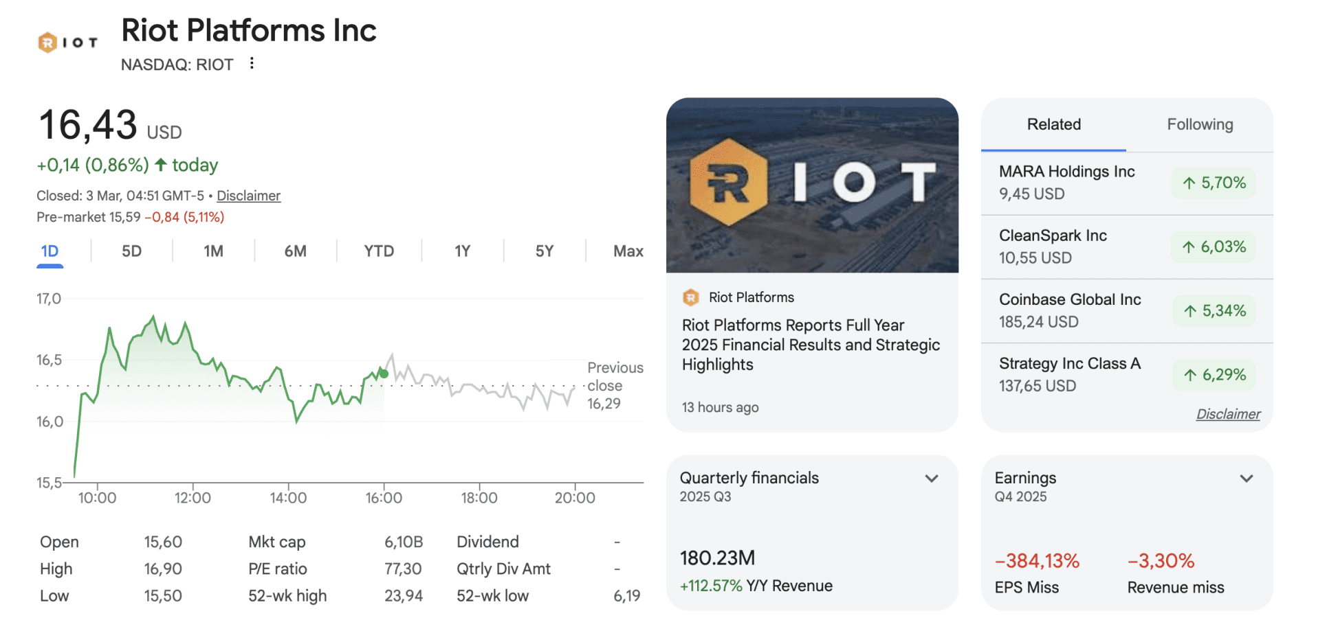TeraWulf tampoco logró cumplir con las expectativas de los analistas. Reportaron ingresos trimestrales de 35,8 millones de dólares, mientras que en el tercer trimestre habÃan alcanzado una facturación de 50,6 millones de dólares.