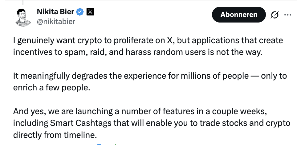 La ola de rumores comenzó después de que Nikita Bier respondiera en X a crÃticas de que la plataforma estarÃa limitando las aplicaciones de criptomonedas. Subrayó que X busca contribuir al crecimiento de las criptomonedas, siempre que no genere spam o abuso. Al mismo tiempo, insinuó la llegada de las ‘Smart Cashtags’.