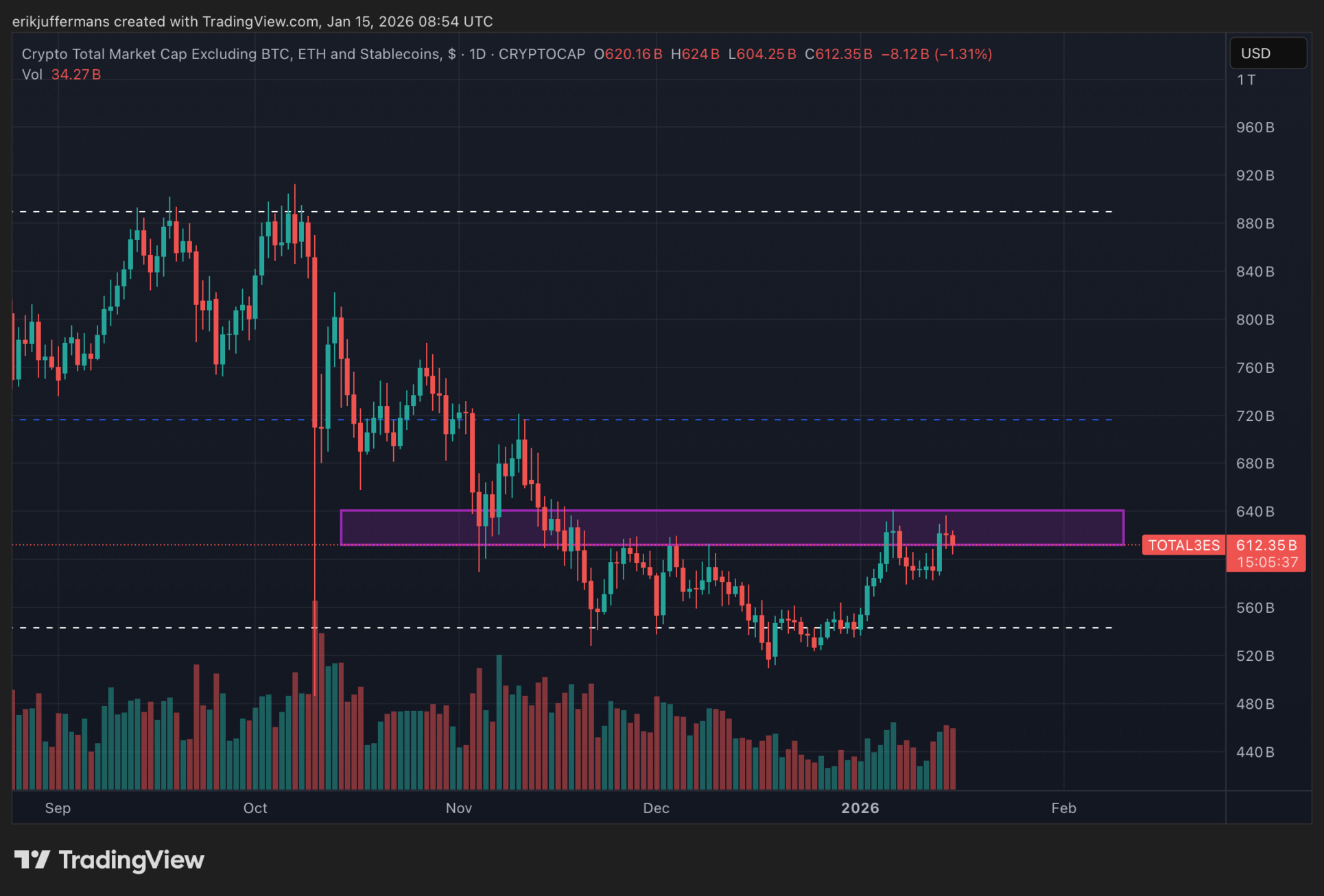 Primero, observamos el gráfico TOTAL3ES. Este gráfico muestra el valor total del mercado de criptomonedas, excluyendo Bitcoin, Ethereum (ETH) y las stablecoins. Es decir, representa todo el mercado de altcoins.