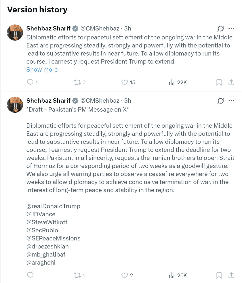 La discusión se centra en el historial de ediciones del mensaje de Sharif. Según investigadores en línea, primero se vio una versión más corta, y luego apareció un texto más extenso que pedía explícitamente una extensión de dos semanas y la reapertura del Estrecho de Ormuz.