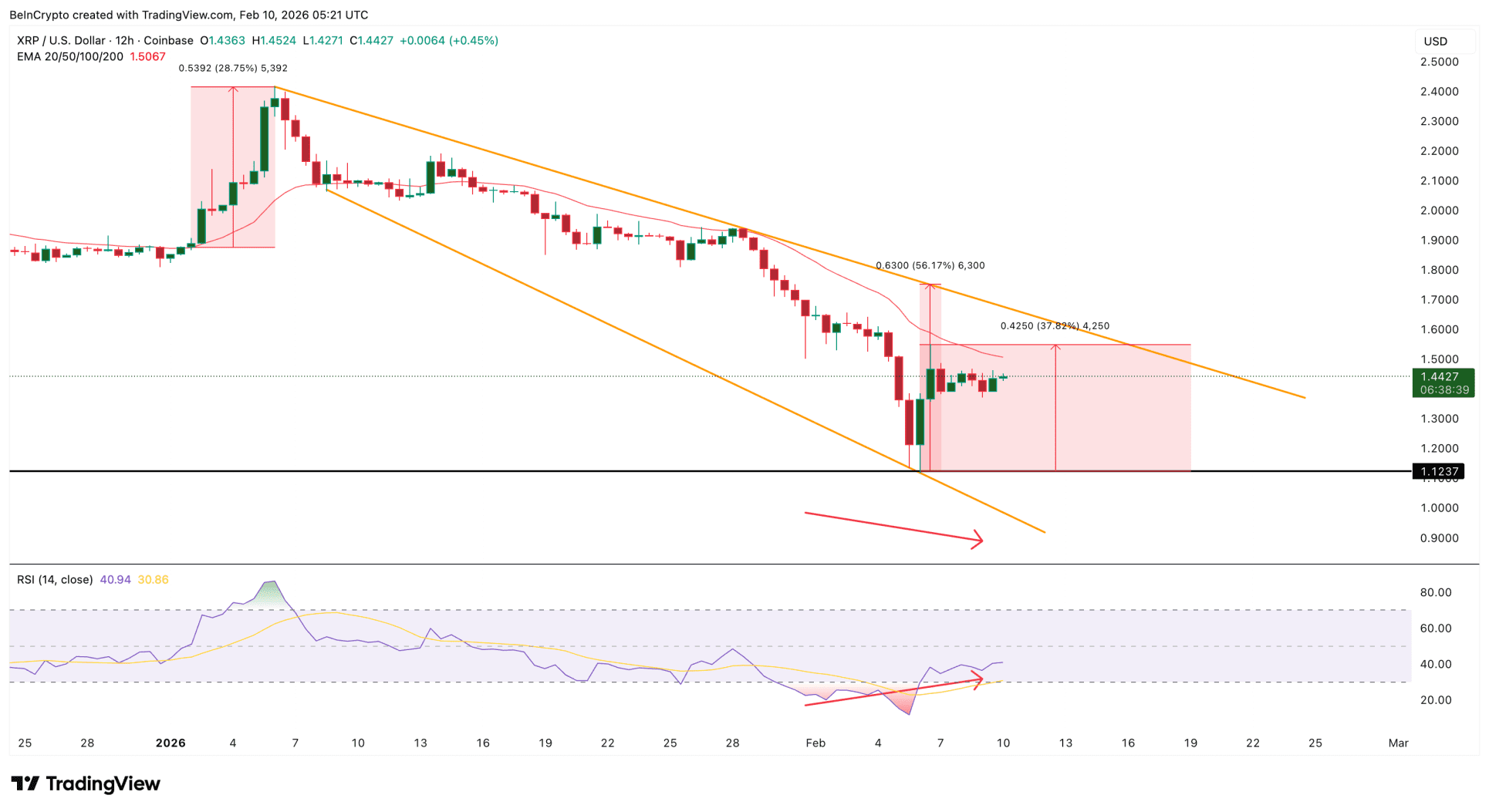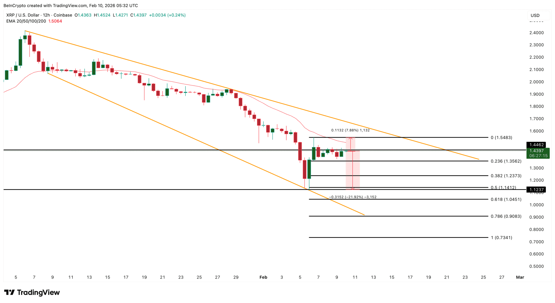En marcos de tiempo más cortos, XRP se mueve dentro de un patrón de cuña descendente, una estructura técnica que, en teoría, deja espacio para una ruptura al alza. Para que tal escenario se materialice, el precio debe superar convincentemente una tendencia de corto plazo significativa, como la media exponencial de 20 días.