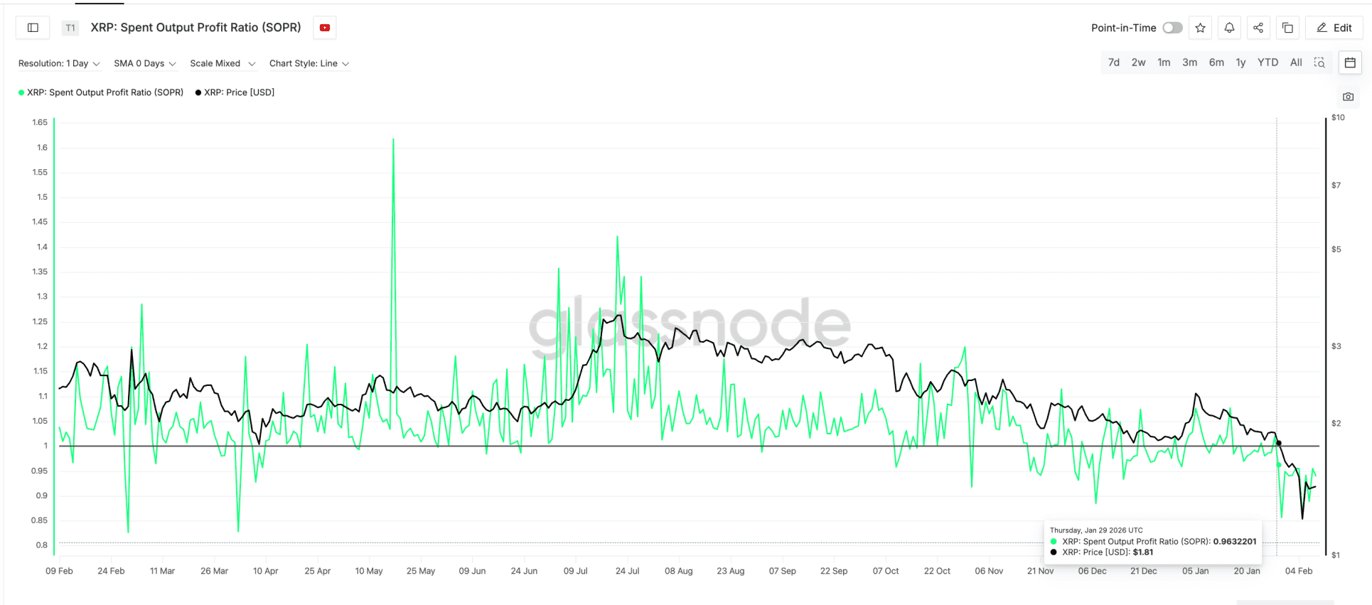 Una medida clave es la Spent Output Profit Ratio (SOPR), que muestra si las monedas se venden con ganancias o pérdidas. Desde finales de enero, este indicador se mantiene por debajo de 1, lo que significa que las transacciones se realizan en promedio con pérdidas.