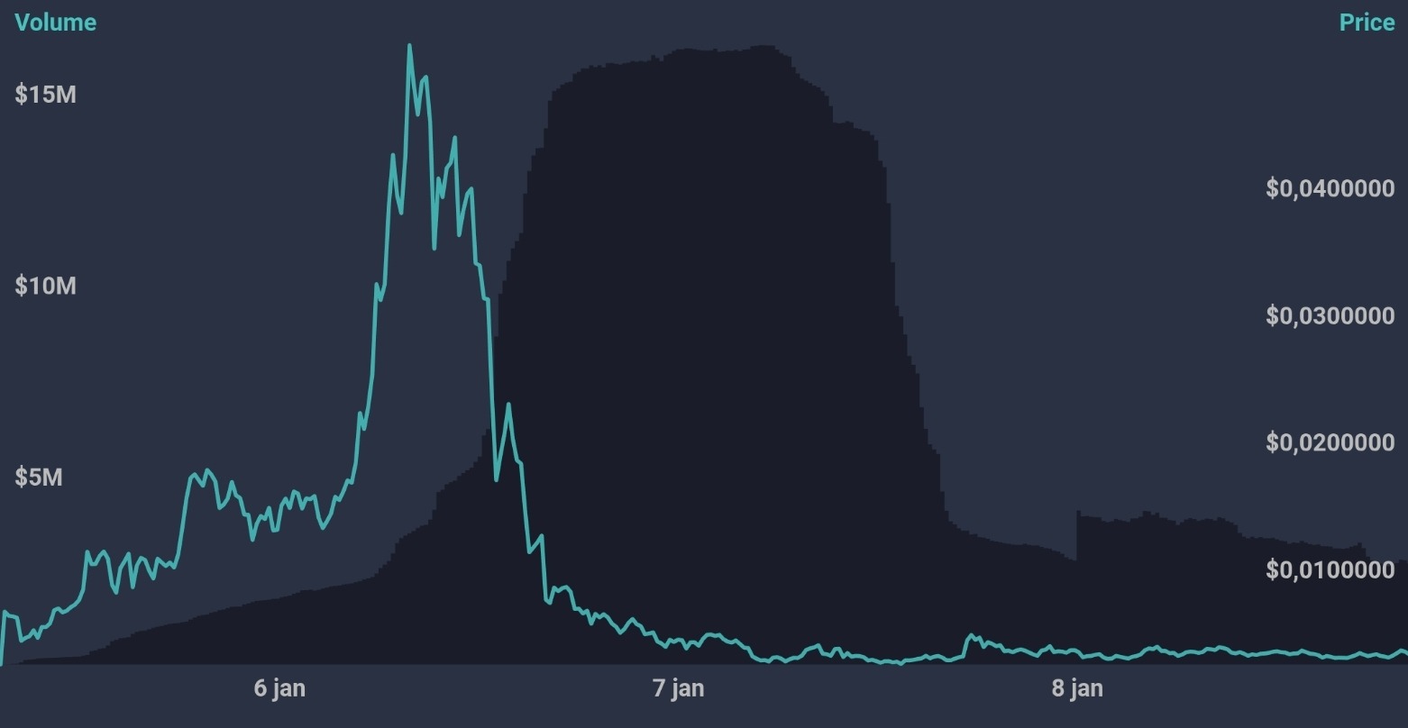 Después de la acumulación, la moneda comenzó a atraer cada vez más atención. El volumen de comercio aumentó, al igual que la capitalización total del mercado, que se disparó hacia los 16,8 millones de dólares. Bajo esta presión de compra, el precio subió rápidamente y alcanzó un pico de 0,05 dólares. Esto elevó el valor de la posición del inversor a unos 2,8 millones de dólares.
