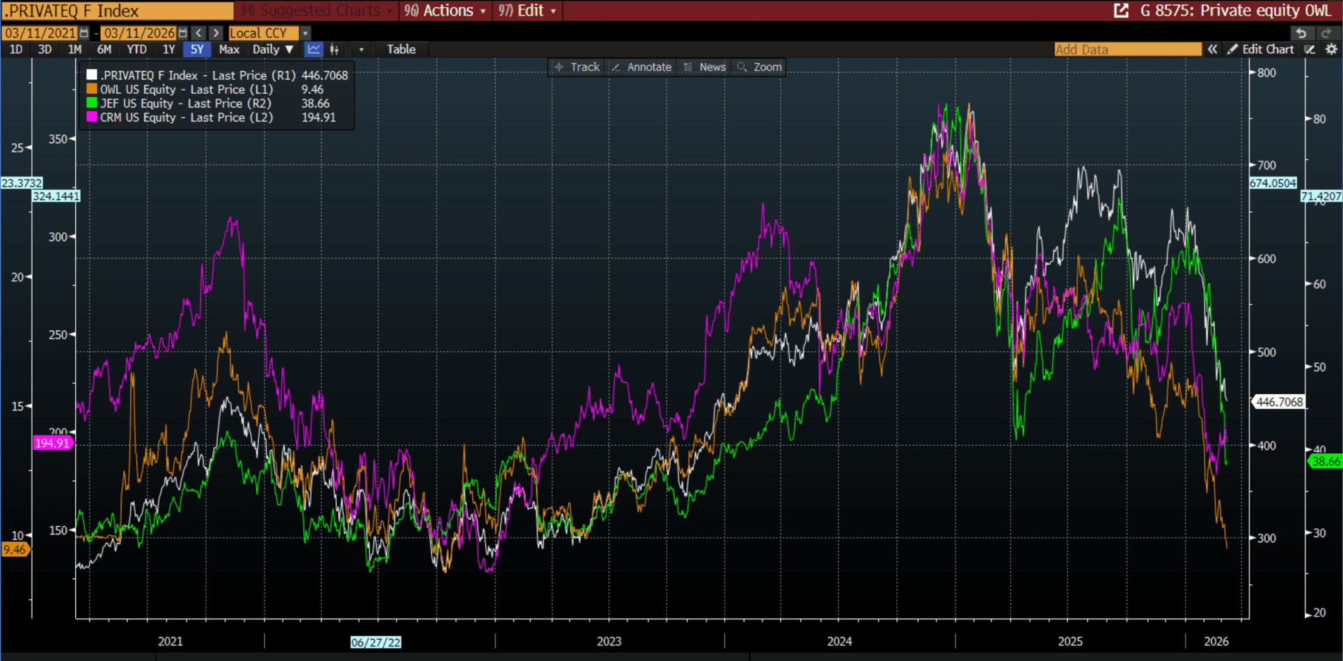 Juntas, estas líneas dibujan un patrón clásico: primero retroceden las acciones de crecimiento, luego las instituciones financieras y, finalmente, los mercados privados. Históricamente, esto ha ocurrido con frecuencia antes de importantes correcciones de mercado o recesiones.