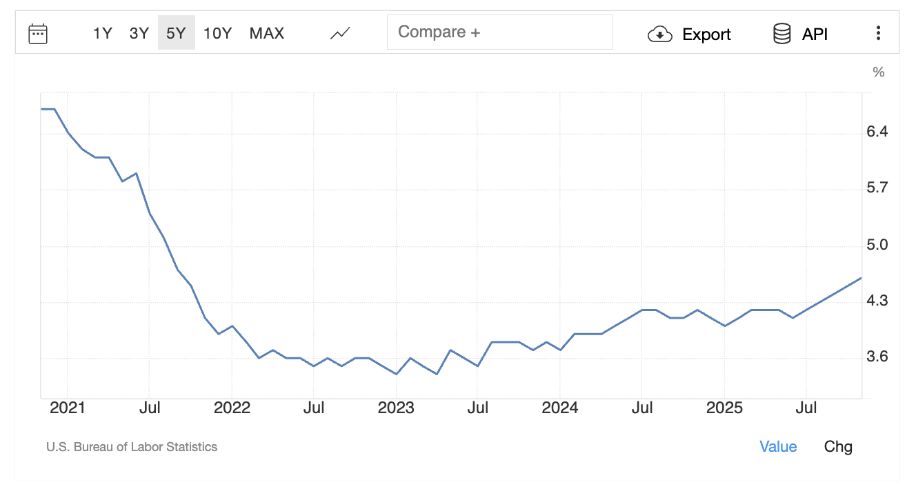 En los últimos meses, hemos observado un debilitamiento constante del mercado laboral en Estados Unidos. A principios de 2025, la tasa de desempleo se situaba en el 4,0 por ciento, pero luego aumentó al 4,6 por ciento. Para el informe del viernes se espera una ligera disminución al 4,5 por ciento.