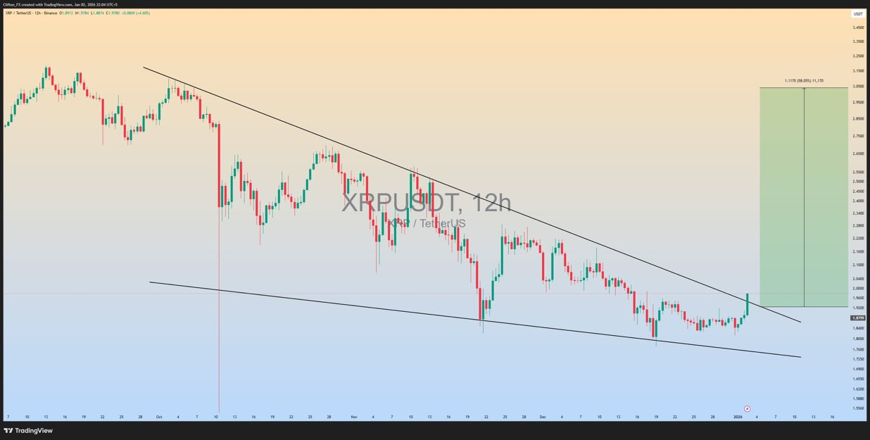 Tras meses de presión a la baja, Ripple (XRP) finalmente muestra signos de fortaleza. Según el analista Maxi, la moneda está saliendo de un canal de tendencia descendente prolongado. En el gráfico de 12 horas se observa cómo XRP alcanza la parte superior del canal y rompe la resistencia a largo plazo.