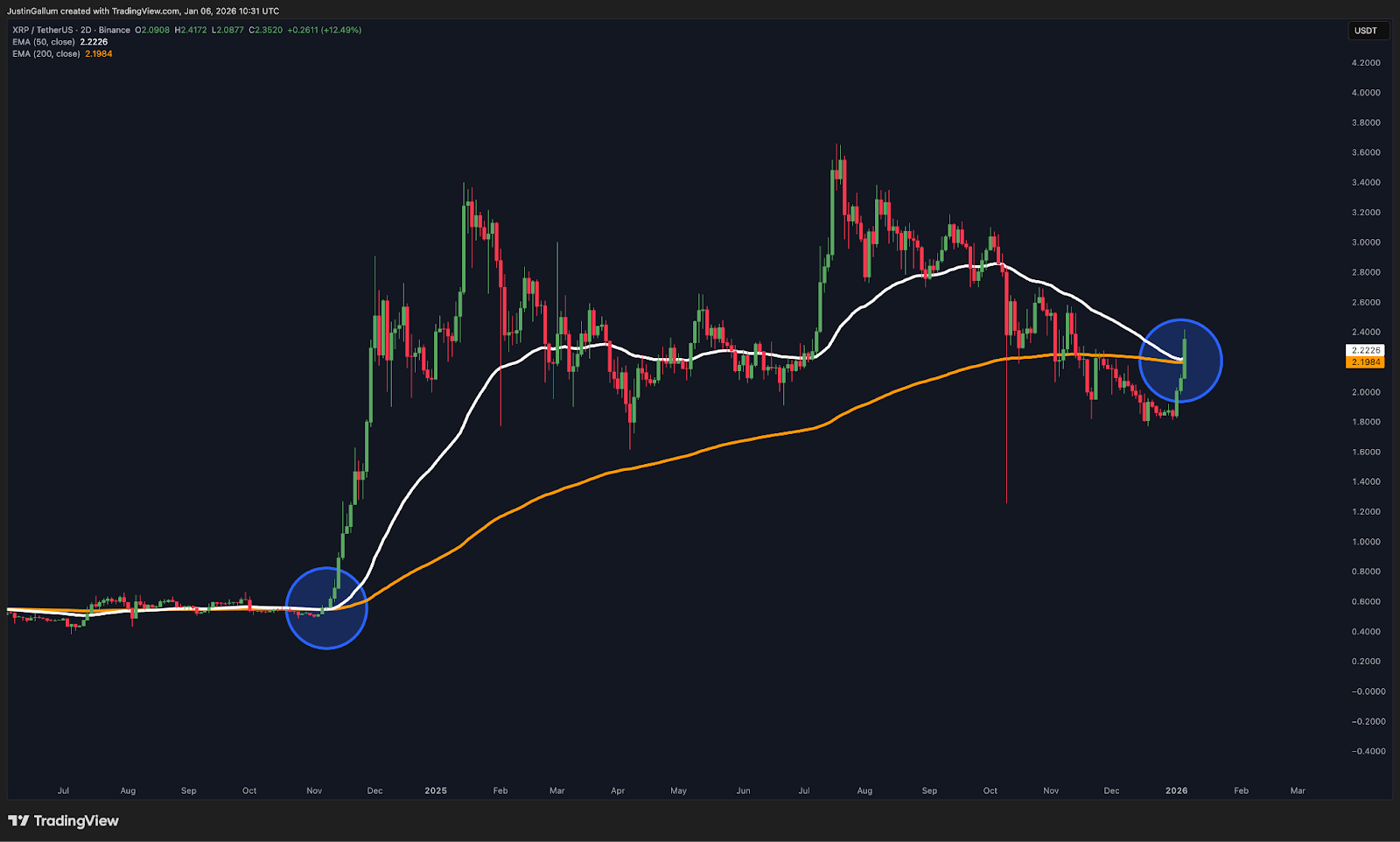 XRP golden cross y death cross en el gráfico de 2 días. – Fuente: TradingView